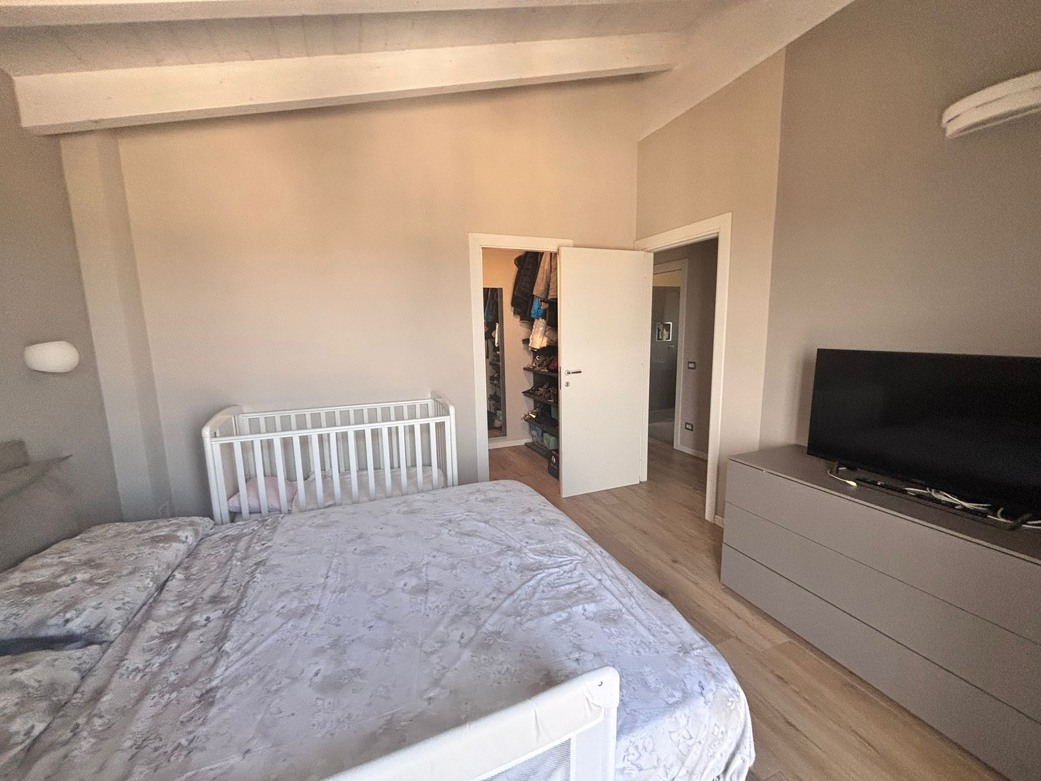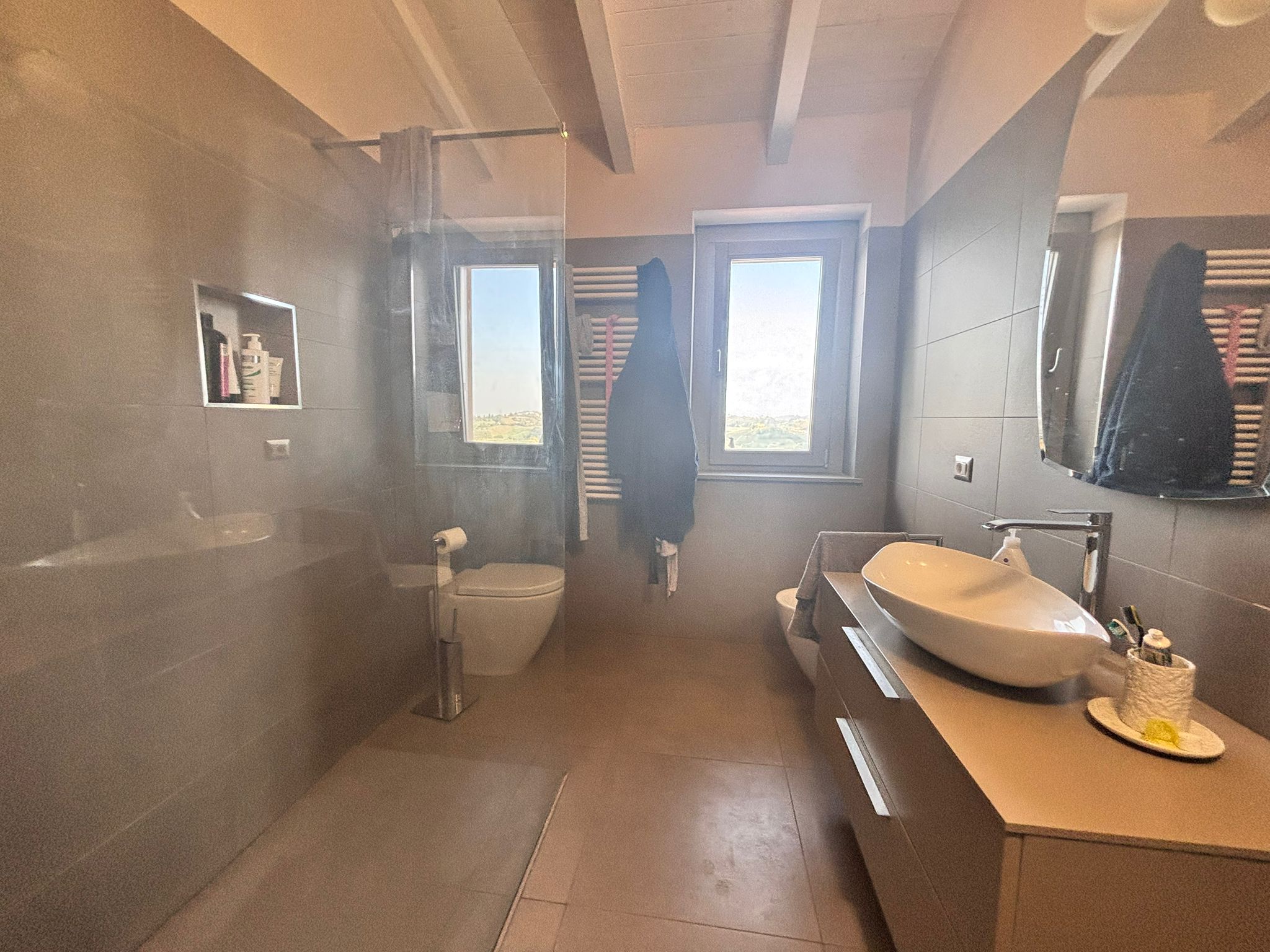 Al piano superiore, la zona notte ospita tre camere da letto, di cui una padronale con cabina armadio, due bagni finestrati e uno splendido terrazzo panoramico, da cui godere di una vista mozzafiato sulle colline circostanti.