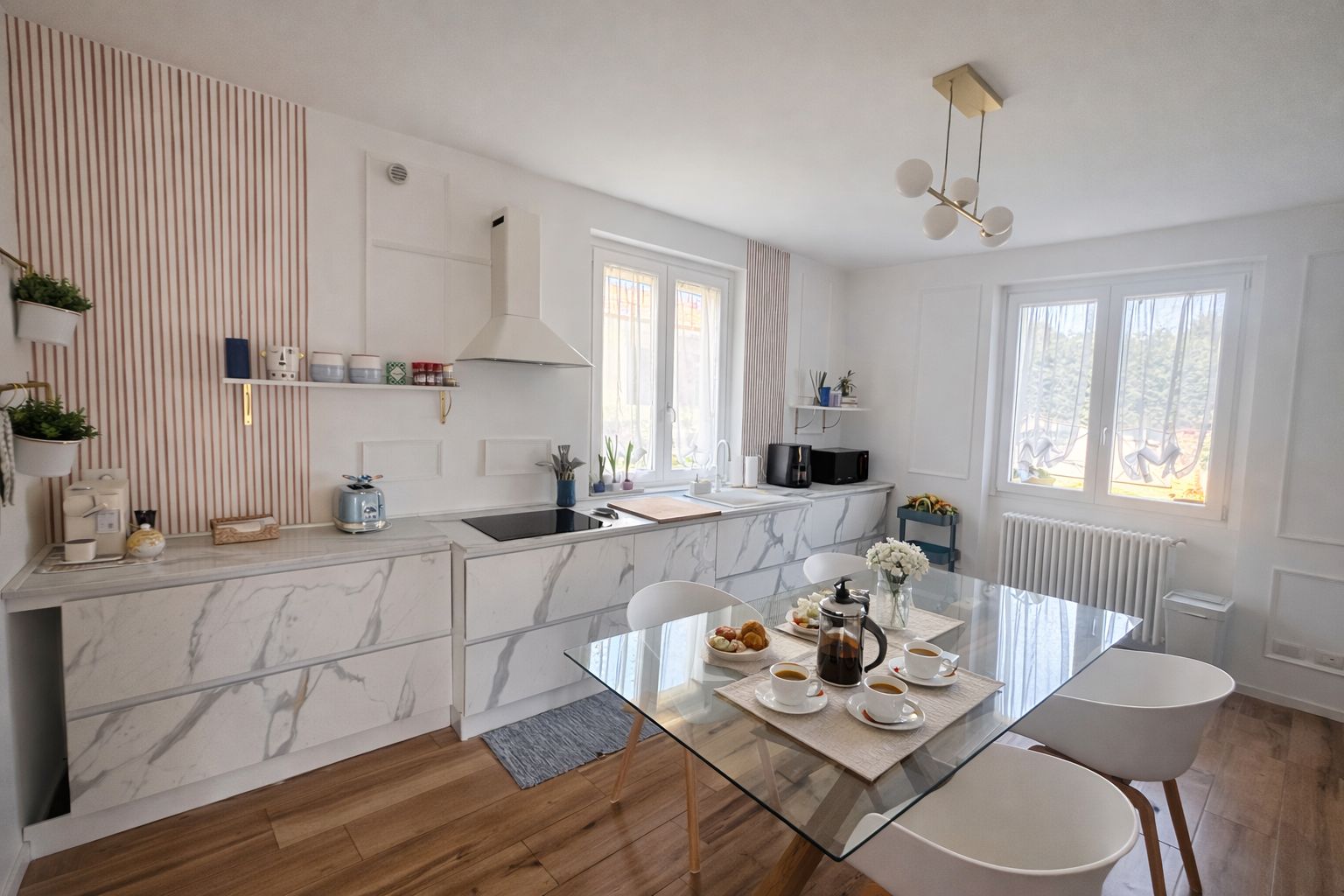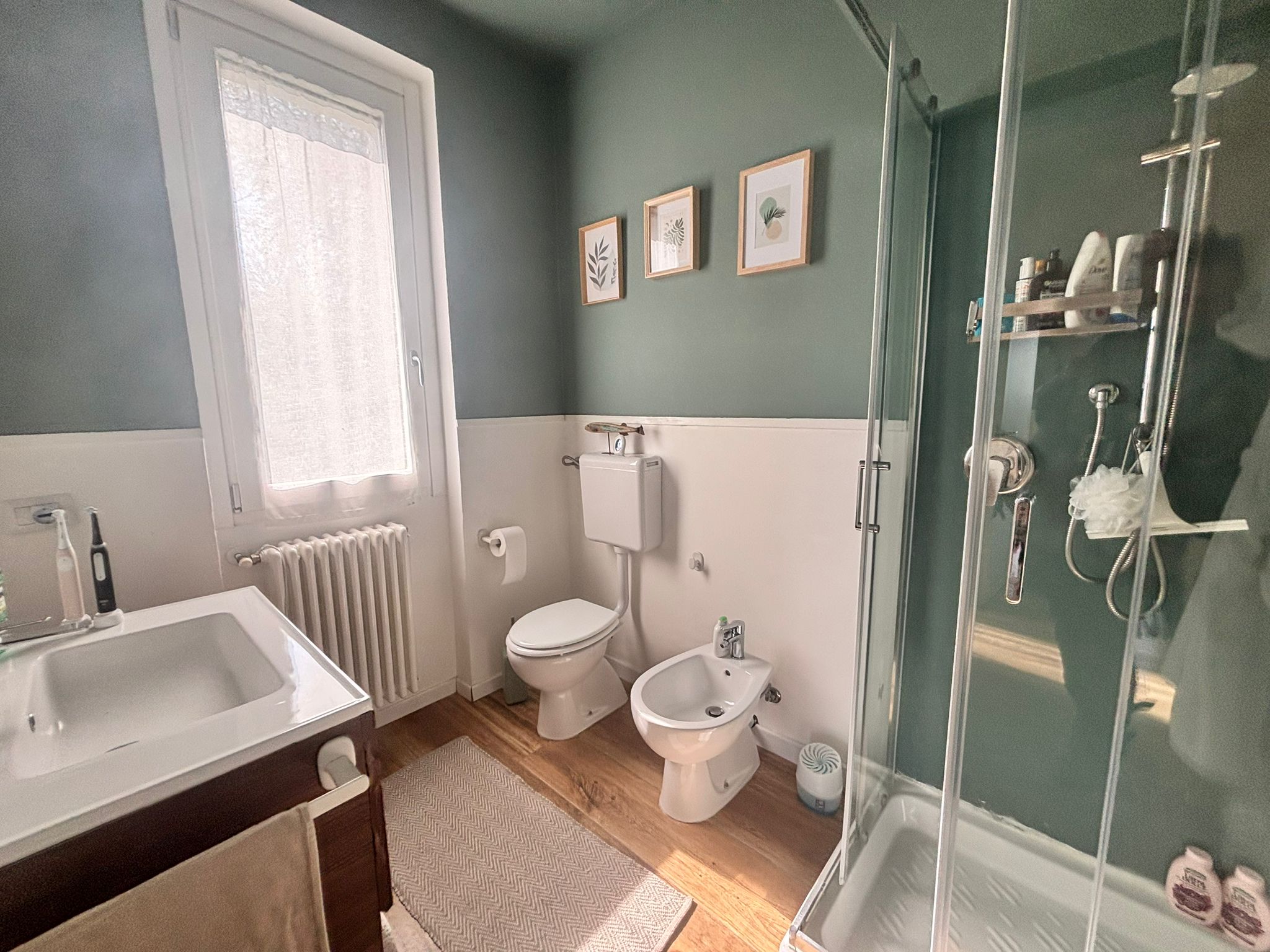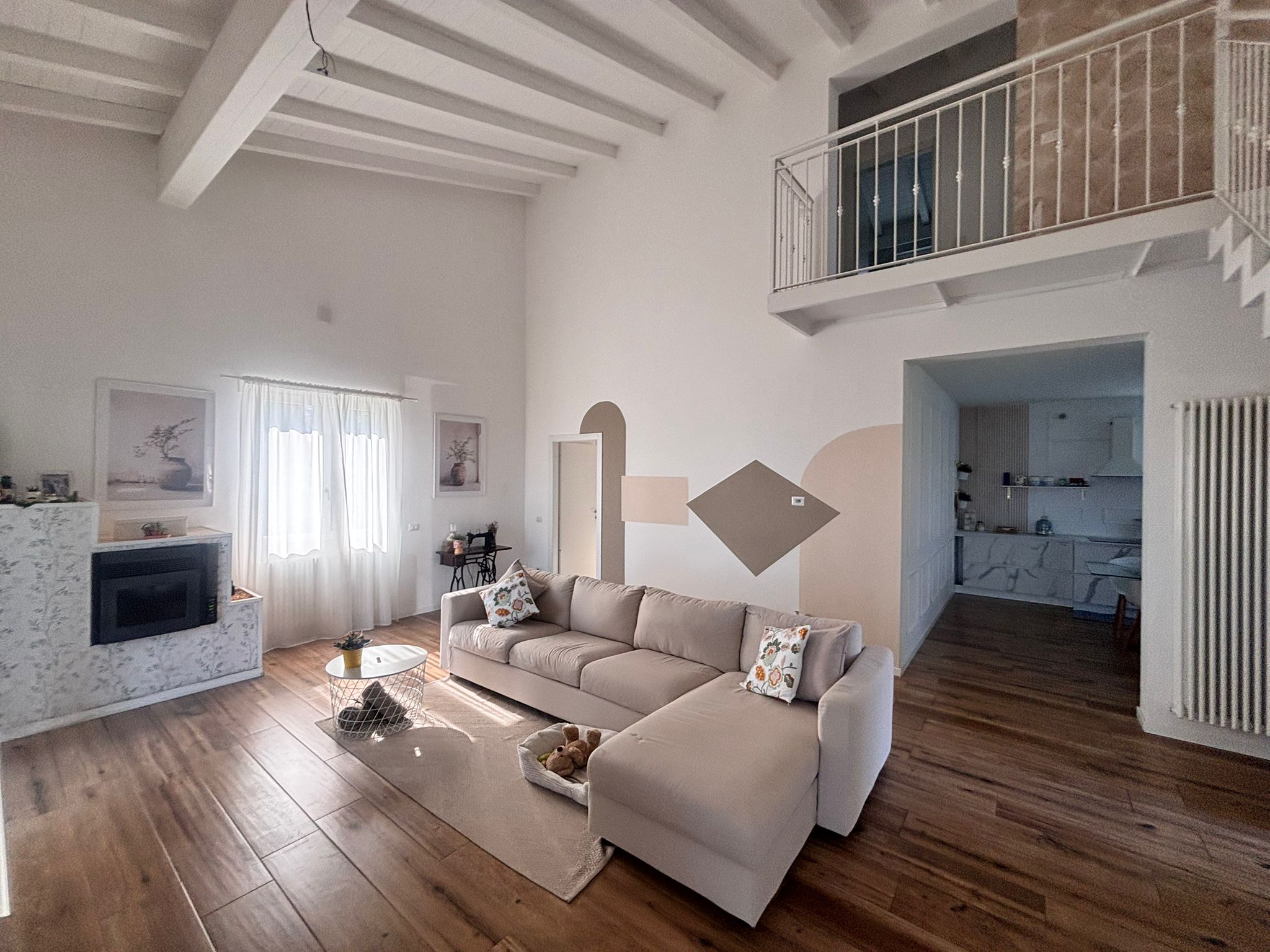 Al piano superiore si sviluppa la zona notte, composta da due spaziose camere matrimoniali, entrambe caratterizzate da eleganti soffitti alti in legno laccato bianco, e un ulteriore bagno.